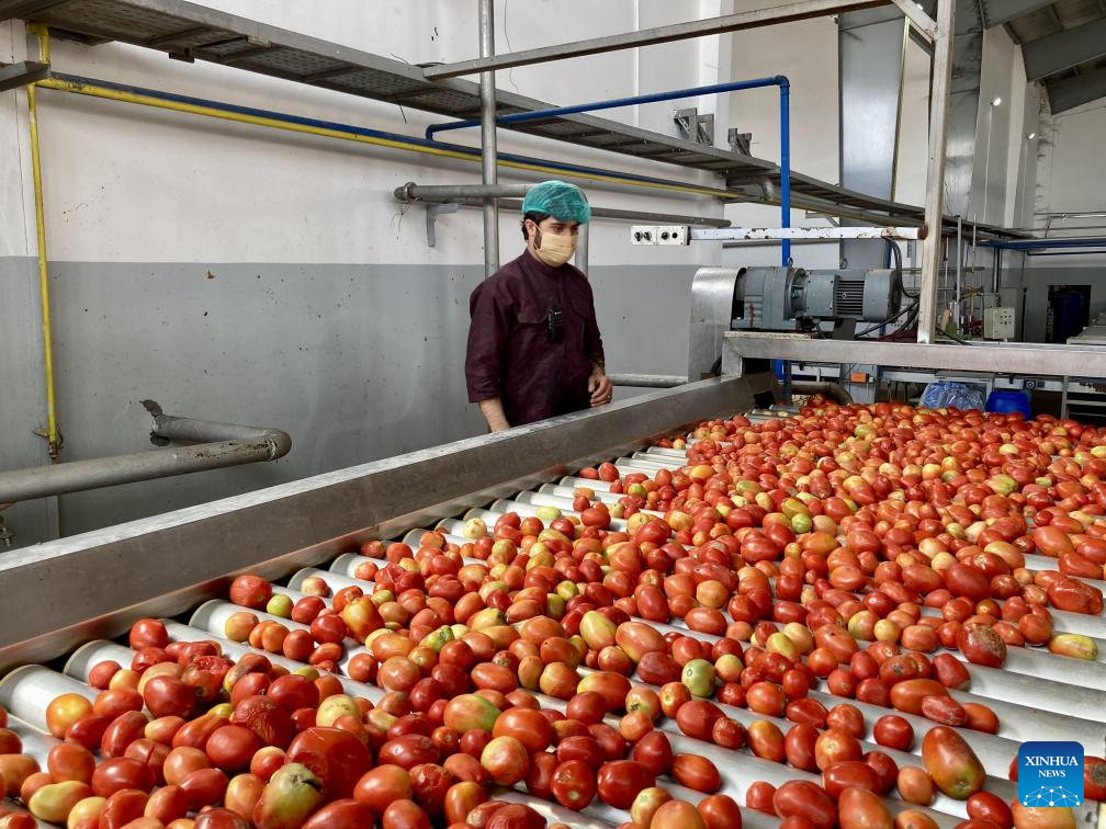 This photo taken on Oct. 7, 2023 shows tomatoes in processing at Afghanistan's first-ever tomato paste plant in Kandahar Province, Afghanistan. The plant has been established here and began operation recently, head of Kandahar Industrial Park Mufti Ali Mohammad said Thursday. (Photo by Arghand/Xinhua)