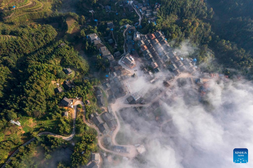 This aerial photo taken on Oct. 31, 2023 shows the autumn view in Xinsheng Village of Congjiang County, southwest China's Guizhou Province. (Photo by Wu Dejun/Xinhua)