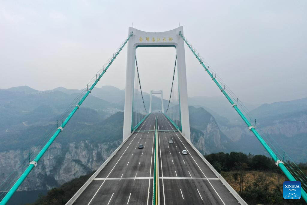 This aerial photo taken on Nov. 24, 2023 shows vehicles running on the Jinfeng Wujiang River Bridge along the expressway linking Guiyang and Jinsha of southwest China's Guizhou Province and Gulin of southwest China's Sichuan Province. The Guiyang-Jinsha-Gulin Expressway, which officially opened to traffic on Friday, is going to cut the travel time from Guiyang to Jinsha County by half from two hours to about one hour. (Xinhua/Yang Wenbin)