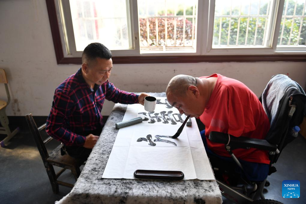 Zhou Guomin (R), a member of the Shangshan Service Center for the Disabled, practices calligraphy in Lianhuashan Village, Yuelu District of Changsha, central China's Hunan Province, Jan. 13, 2024. (Xinhua/Chen Zhenhai)