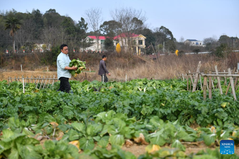 Guo Weixin (L) and Xie Huiqing, both members of the Shangshan Service Center for the Disabled, work on a farmland in Lianhuashan Village, Yuelu District of Changsha, central China's Hunan Province, Jan. 13, 2024. (Xinhua/Chen Zhenhai)
