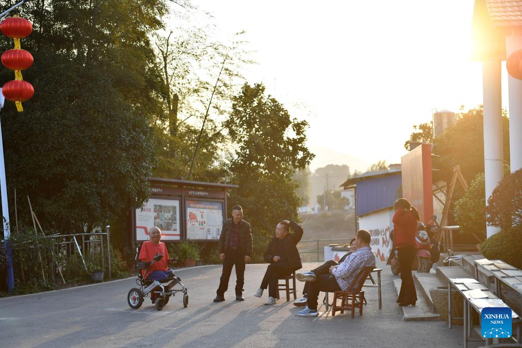 Xie Xiangqian (2nd L) and Zhou Guomin (1st L), both members of the Shangshan Service Center for the Disabled, chat with villagers in Lianhuashan Village, Yuelu District of Changsha, central China's Hunan Province, Jan. 13, 2024. (Xinhua/Chen Zhenhai)