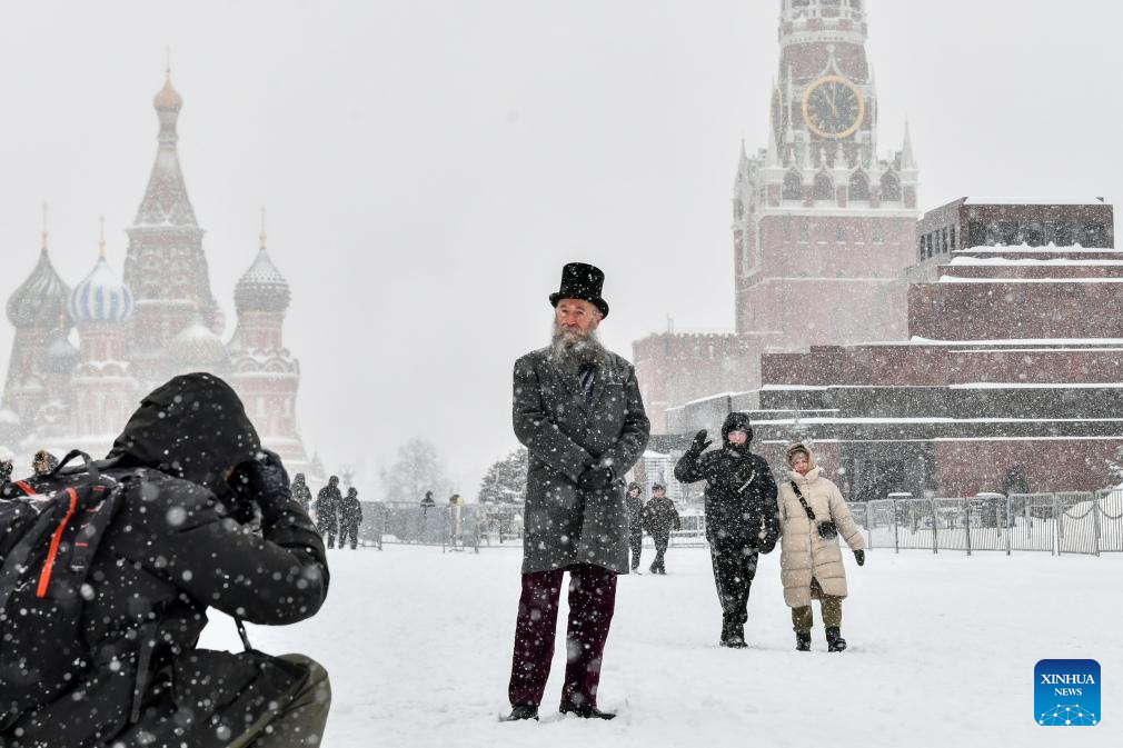 A visitor poses for a photo amid snowfall in Moscow, Russia, Feb. 15, 2024. A heavy snow hit Moscow on Thursday. (Xinhua/Cao Yang)