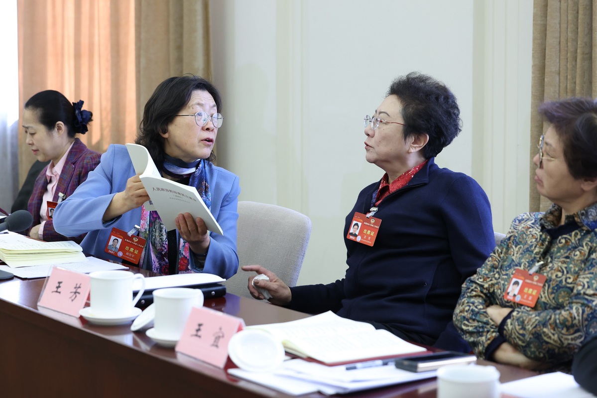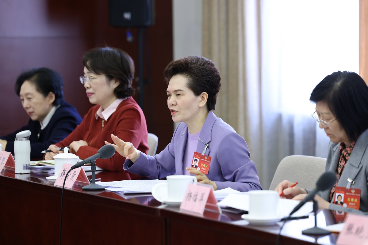 Chen Siyuan, right, a member of the 14th National Committee of the Chinese People's Political Consultative Conference, speaks at a panel discussion on the Government Work Report on March 6, 2024. [Photo by Zou Hong/chinadaily.com.cn]