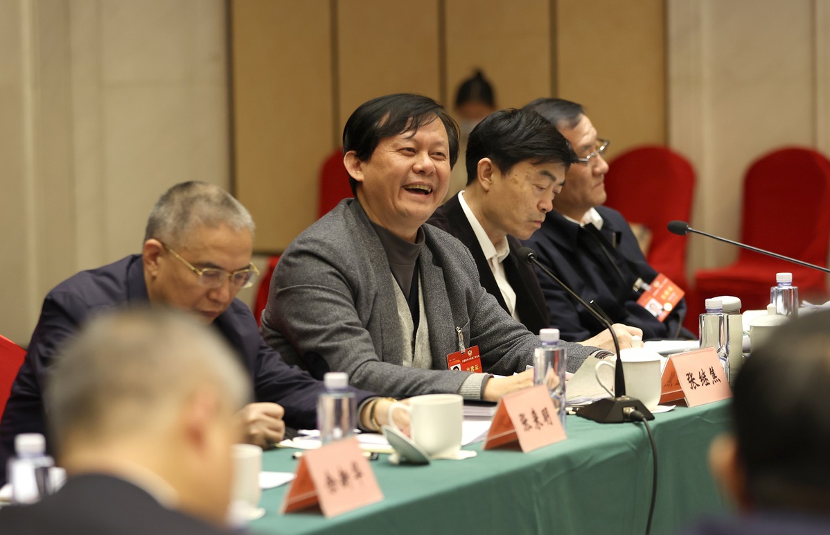 Zheng Yongfei, front, a member of the 14th National Committee of the Chinese People's Political Consultative Conference, speaks at a panel discussion on the Government Work Report on March 6, 2024. [Photo by Jiang Dong/chinadaily.com.cn]