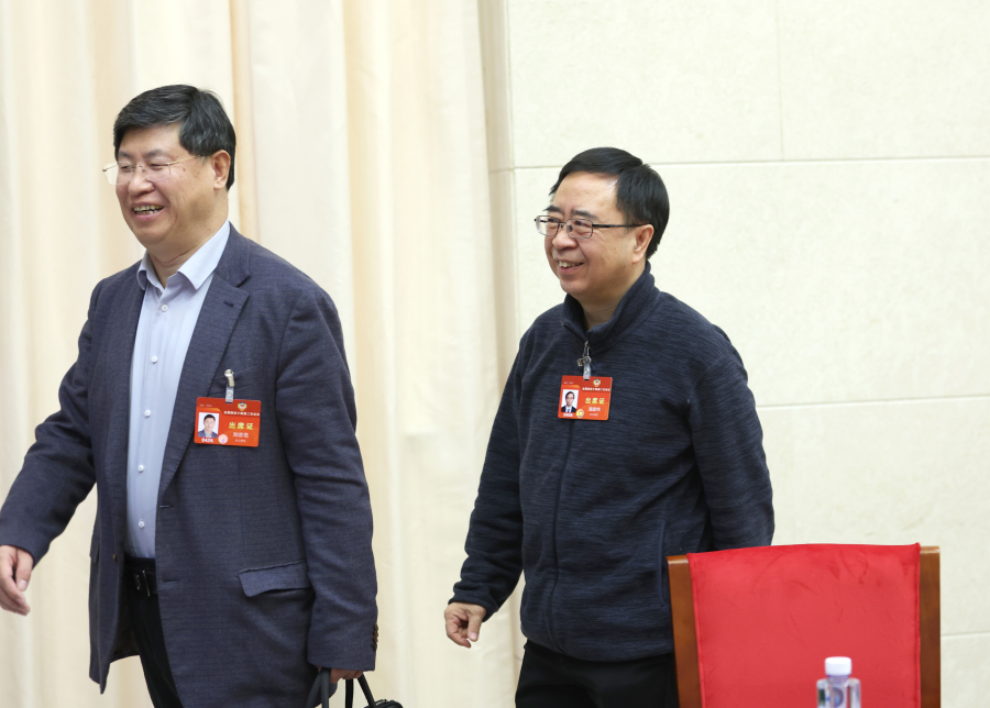 Pan Jianwei, right, and Liu Zhongfan, members of the 14th National Committee of the Chinese People's Political Consultative Conference, walk out of the venue after a panel discussion on March 6, 2024. [Photo by Zou Hong/chinadaily.com.cn]