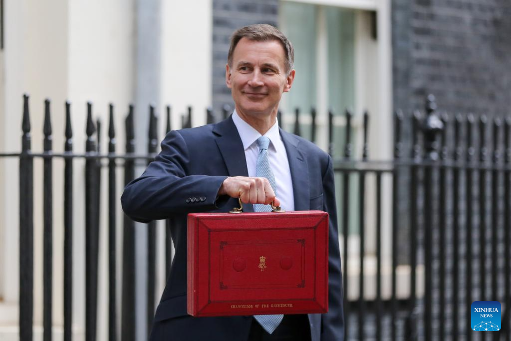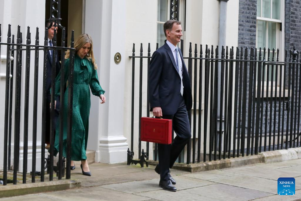 The United Kingdom's (UK) Chancellor of the Exchequer Jeremy Hunt (1st R) leaves 11 Downing Street to deliver his budget to Parliament in London, Britain, on March 6, 2024. The United Kingdom's (UK) Chancellor of the Exchequer Jeremy Hunt on Wednesday announced in his spring budget that National Insurance contributions would be cut for 27 million British workers. (Xinhua)