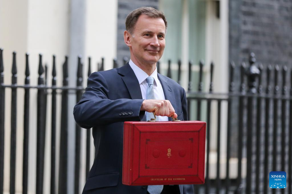 The United Kingdom's (UK) Chancellor of the Exchequer Jeremy Hunt poses for photographs as he leaves 11 Downing Street to deliver his budget to Parliament in London, Britain, on March 6, 2024. The United Kingdom's (UK) Chancellor of the Exchequer Jeremy Hunt on Wednesday announced in his spring budget that National Insurance contributions would be cut for 27 million British workers. (Xinhua)