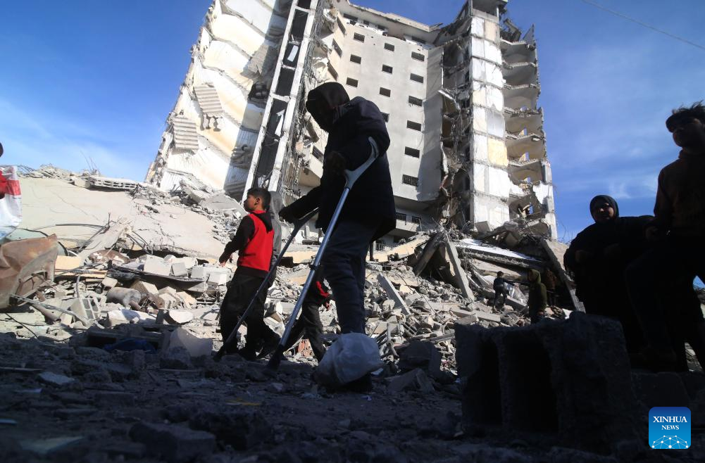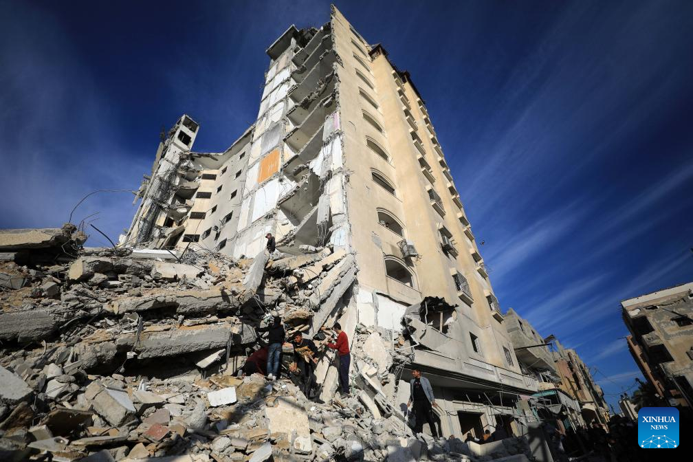 People inspect destroyed buildings after intense airstrikes in the southern Gaza Strip city of Rafah, on March 9, 2024. The Palestinian death toll from ongoing Israeli attacks on the Gaza Strip has risen to 30,960 with 72,524 others wounded, the Hamas-run Health Ministry said in a press statement on Saturday. (Photo by Yasser Qudih/Xinhua)