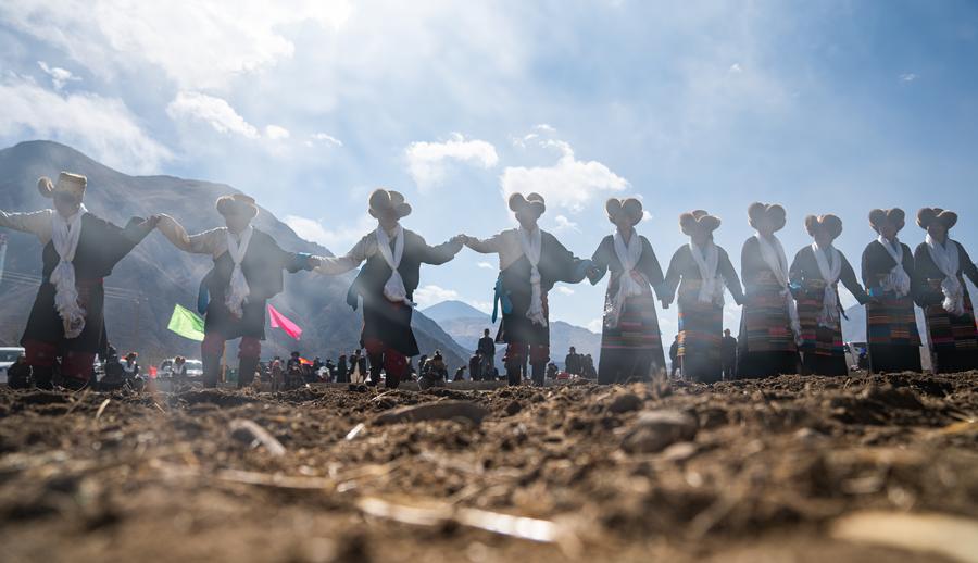 Farmers sing during a ceremony marking the start of spring farming in Doilungdeqen district of Lhasa, southwest China's Xizang Autonomous Region, March 16, 2024. (Xinhua/Tenzin Nyida)