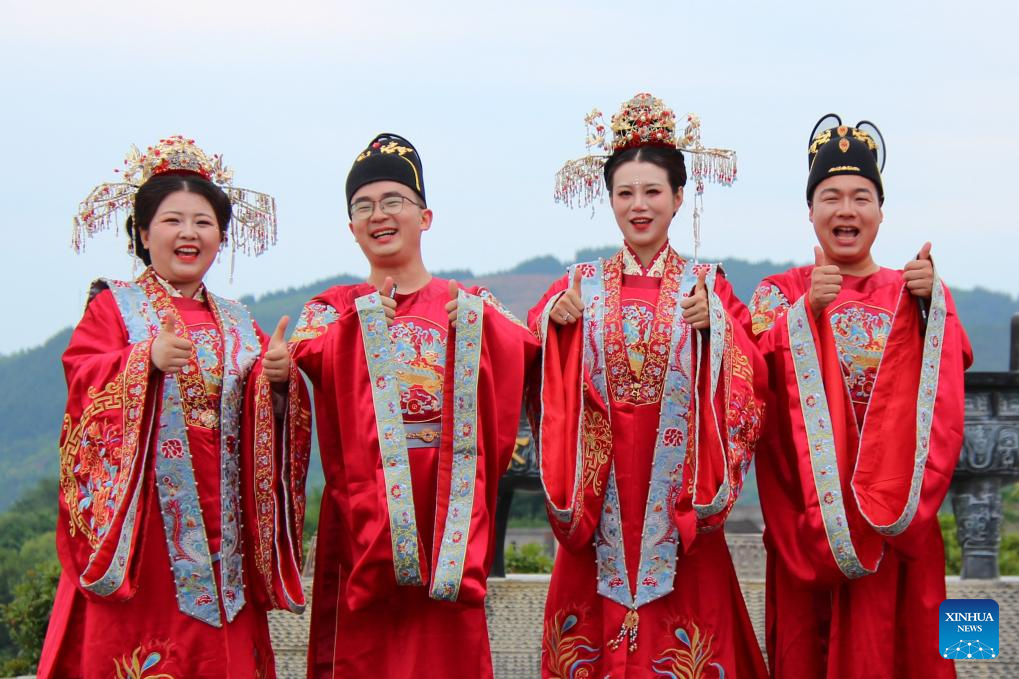Couples dressed in traditional costumes take part in a group wedding in Shiyan, central China's Hubei Province, May 20, 2024. Ten couples participated in a group wedding here on Monday. (Photo by Cao Zhonghong/Xinhua)