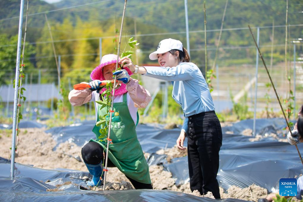 Wang Xiuzhen (R), head of Fujian Youxuan Agricultural Development, instructs a farmer to transplant passion fruit seedlings in Wuping County, Longyan, east China's Fujian Province, April 5, 2023. (Xinhua)