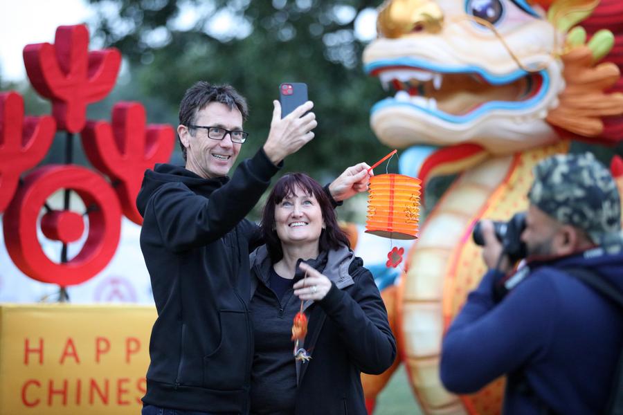 Tourists take selfies in front of a dragon-shaped installation to welcome the Chinese Lunar New Year at Hagley Park in Christchurch, New Zealand, Feb. 9, 2024. (Photo by Meng Tao/Xinhua)