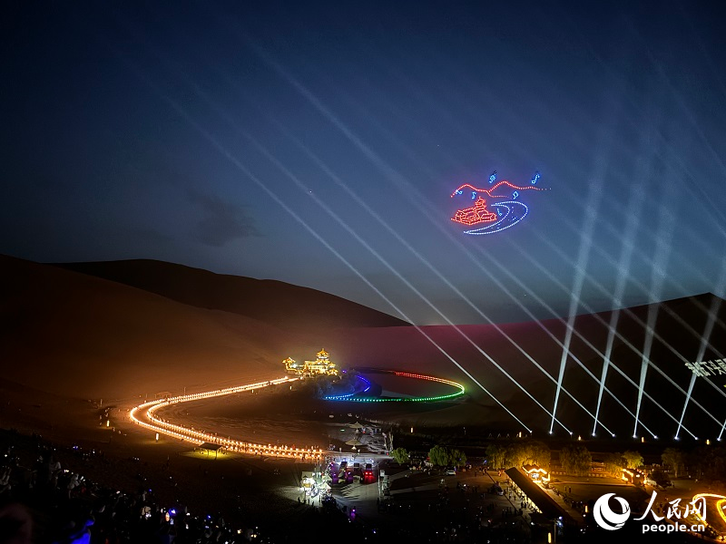 Photo shows a drone performance at Mingsha Mountain in Dunhuang, northwest China’s Gansu Province. (People’s Daily Online/Zhao Wen)