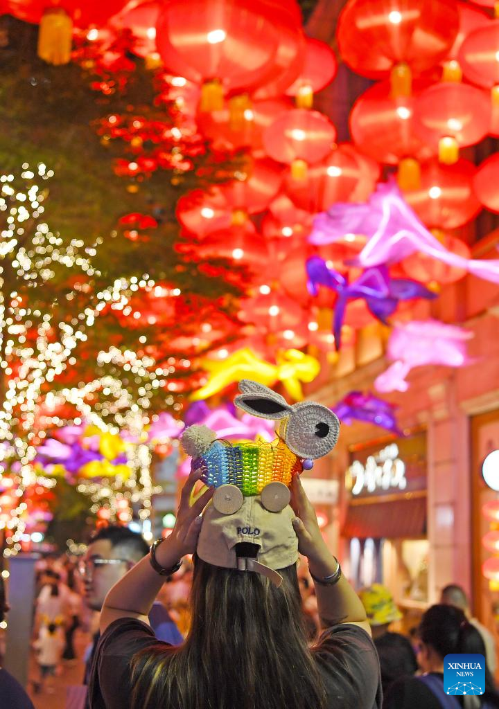 This year's lantern displays featured numerous highlights including Chinese traditional clothing, local cuisine, and giant pandas, attracting people to take photos in front of them.