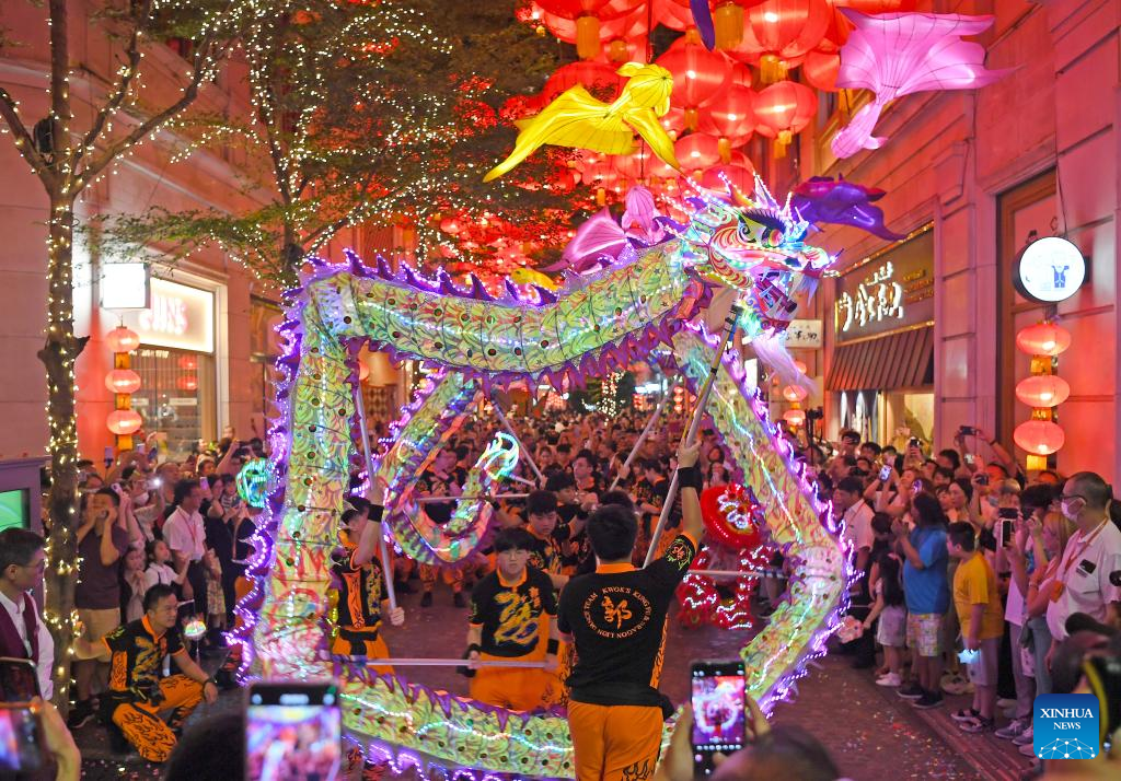 People watch a dragon dance during the Mid-Autumn Festival in Hong Kong, south China, Sept. 17, 2024. (Xinhua/Chen Duo)