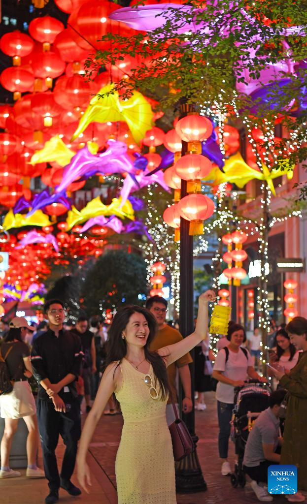 People pose for photos with red lanterns during the Mid-Autumn Festival in Hong Kong, south China, Sept. 17, 2024. (Xinhua/Chen Duo)