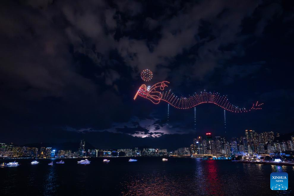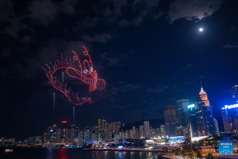 A drone light show in celebration of the Mid-Autumn Festival is staged in Hong Kong, south China, Sept. 17, 2024. (Xinhua/Zhu Wei)