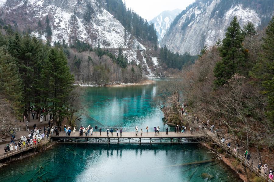 An aerial drone photo shows tourists visiting the Jiuzhaigou scenic spot in southwest China's Sichuan Province, Dec. 7, 2024. (Xinhua/Shen Bohan)