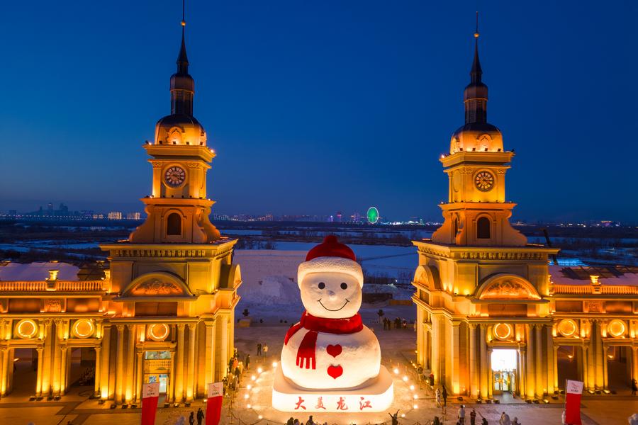 An aerial drone photo taken on Dec. 17, 2024 shows a giant snowman in Harbin, northeast China's Heilongjiang Province. (Xinhua/Zhang Tao)
