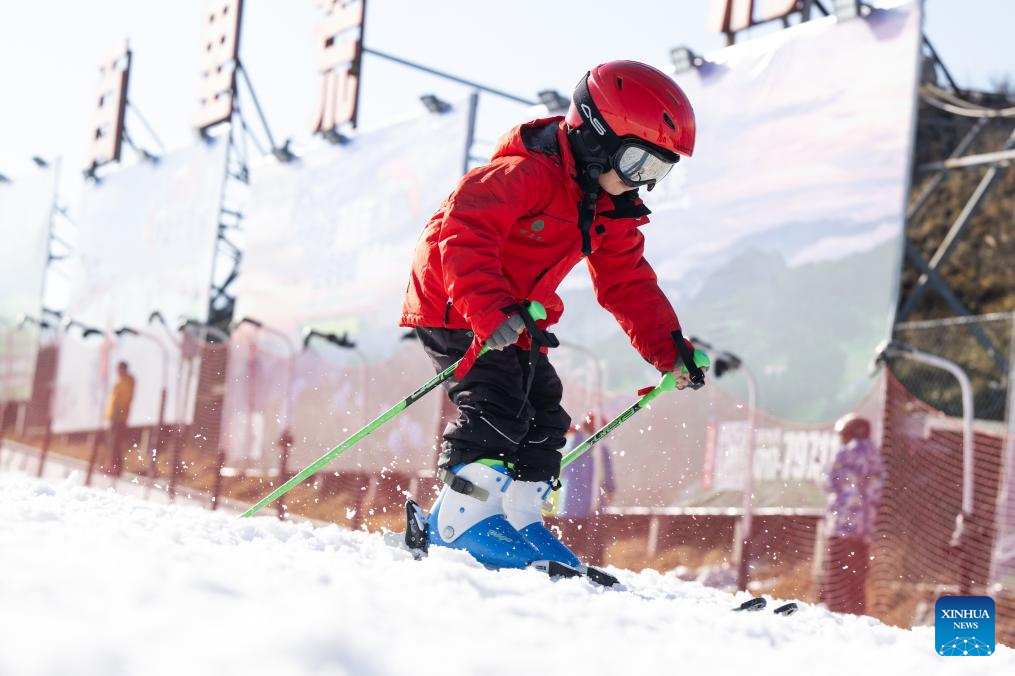 A child skis at Bailihuang Ski Resort in Yichang City, central China's Hubei Province, Jan. 5, 2025. In recent years, Yichang has explored its ice and snow tourism resources, attracting numerous tourists. (Xinhua/Xiao Yijiu)