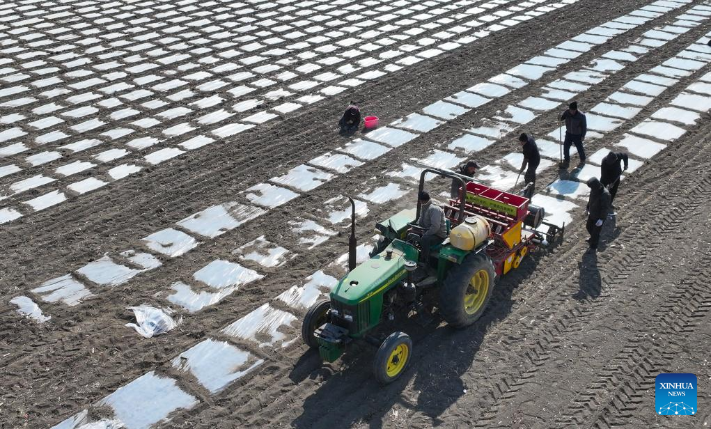 A drone photo taken on Feb. 18, 2025 shows a seeder equipped with the BeiDou Navigation Satellite System sowing in a field during the day of Yushui (Rain Water), the second of the 24 solar terms in the Chinese lunar calendar, in Lintingkou Town, Baodi District, north China's Tianjin Municipality. (Xinhua/Sun Fanyue)