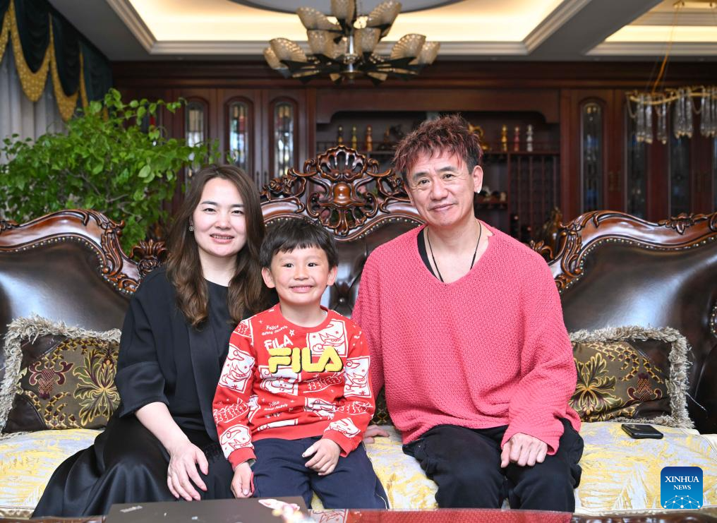 An Jong Euk takes a family photo with his wife Shi Jifang and their youngest son at home in Urumqi, northwest China's Xinjiang Uygur Autonomous Region, March 18, 2025. Hairdresser An Jong Euk is from Suwon, South Korea, and has been working and living in Xinjiang for more than 20 years. He first worked in a Korean hair salon in Urumqi, where he met his wife Shi Jifang, a colleague at that time. Later, the two of them seized the market opportunity and opened their own hair salon. The hairdresser's business expanded from a small hairdressing store to two large high-end salons in Urumqi's central business district and his hard work of bringing beauty to local residents has won him respect in his community. (Xinhua/Hu Huhu)