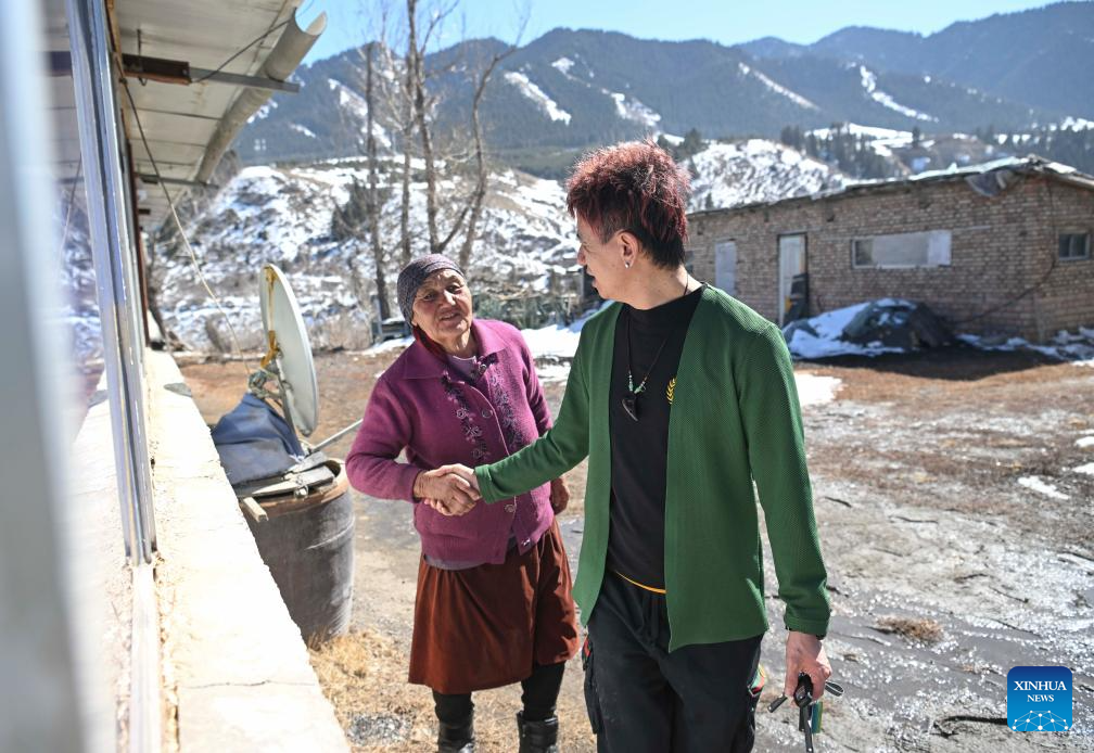 An Jong Euk (R) invites his neighbor to visit his home in Urumqi, northwest China's Xinjiang Uygur Autonomous Region, March 18, 2025. Hairdresser An Jong Euk is from Suwon, South Korea, and has been working and living in Xinjiang for more than 20 years. He first worked in a Korean hair salon in Urumqi, where he met his wife Shi Jifang, a colleague at that time. Later, the two of them seized the market opportunity and opened their own hair salon. The hairdresser's business expanded from a small hairdressing store to two large high-end salons in Urumqi's central business district and his hard work of bringing beauty to local residents has won him respect in his community. (Xinhua/Hu Huhu)