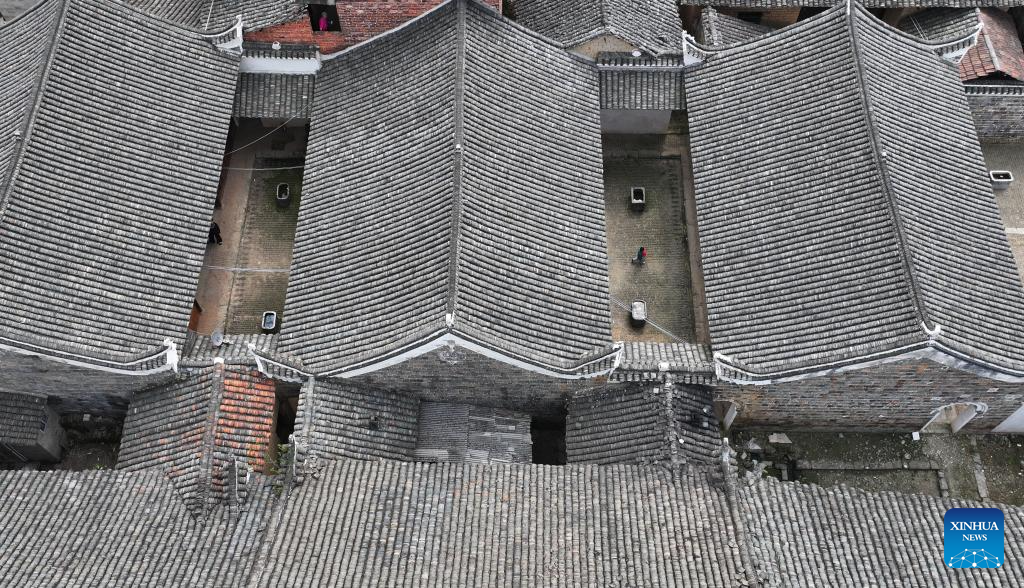 An aerial drone photo taken on March 25, 2025 shows visitors walking at the Zhou Family Courtyard in Lingling District of Yongzhou City, central China's Hunan Province. Boasting a history of hundreds of years, the Zhou Family Courtyard and the Hu Family Courtyard, with their houses crisscrossing in a tightly structured and meticulously arranged layout, showcase a long history and rich cultural heritage of traditional Chinese villages. (Xinhua/Zhao Zhongzhi)