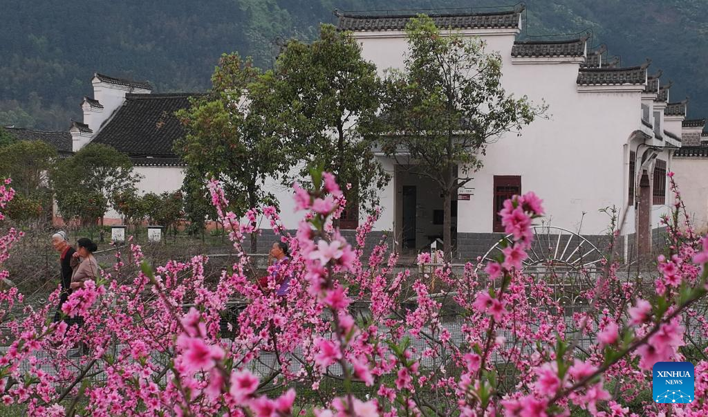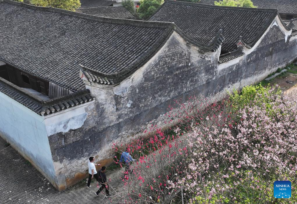 Villagers walk at a garden of the Zhou Family Courtyard in Lingling District of Yongzhou City, central China's Hunan Province, March 25, 2025. Boasting a history of hundreds of years, the Zhou Family Courtyard and the Hu Family Courtyard, with their houses crisscrossing in a tightly structured and meticulously arranged layout, showcase a long history and rich cultural heritage of traditional Chinese villages. (Xinhua/Zhao Zhongzhi)