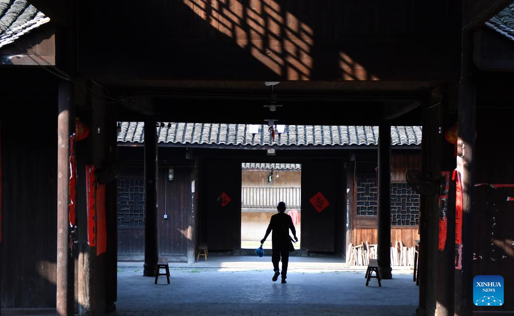 A villager walks at the Zhou Family Courtyard in Lingling District of Yongzhou City, central China's Hunan Province, March 25, 2025. Boasting a history of hundreds of years, the Zhou Family Courtyard and the Hu Family Courtyard, with their houses crisscrossing in a tightly structured and meticulously arranged layout, showcase a long history and rich cultural heritage of traditional Chinese villages. (Xinhua/Zhao Zhongzhi)