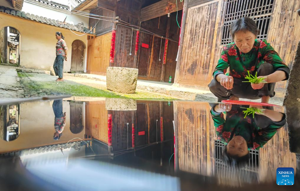 A villager washes vegetable at the Hu Family Courtyard in Lingling District of Yongzhou City, central China's Hunan Province, March 26, 2025. Boasting a history of hundreds of years, the Zhou Family Courtyard and the Hu Family Courtyard, with their houses crisscrossing in a tightly structured and meticulously arranged layout, showcase a long history and rich cultural heritage of traditional Chinese villages. (Xinhua/Zhao Zhongzhi)