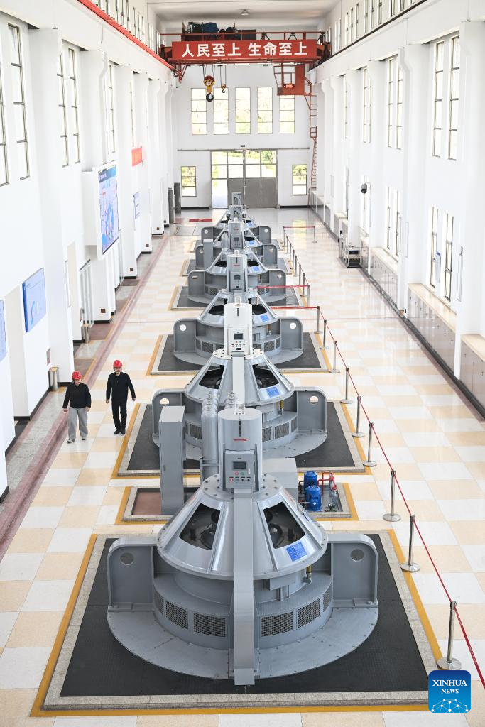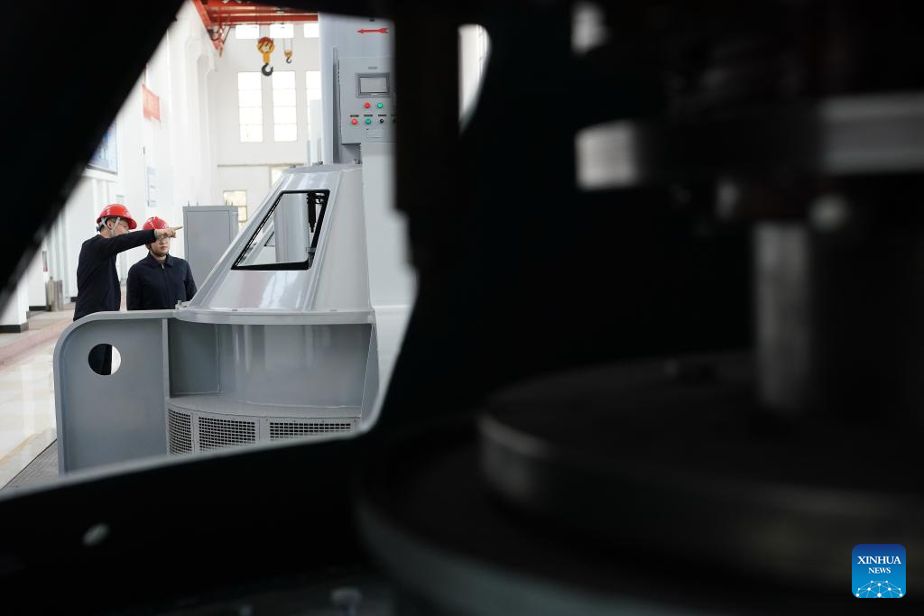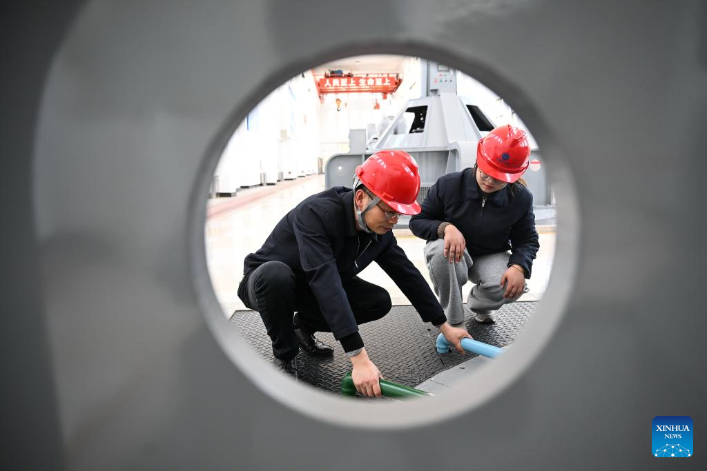 Staff members of the Jiangdu water control project work at a pumping station in Yangzhou, east China's Jiangsu Province, March 25, 2025. The Jiangdu water control project in Yangzhou of east China's Jiangsu Province is located at the source of the eastern route of China's gigantic South-to-North Water Diversion Project.
