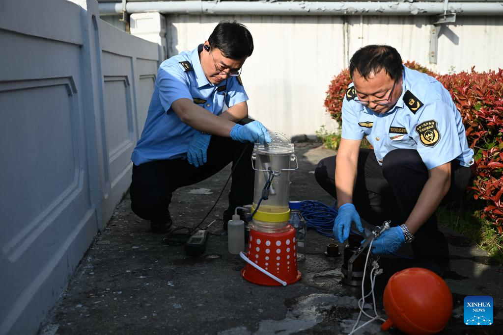 Staff members of Jiangdu ecological environment bureau take water samples on the upper reaches of the water source of the eastern route of the South-to-North Water Diversion Project in Yangzhou, east China's Jiangsu Province, March 25, 2025. The Jiangdu water control project in Yangzhou of east China's Jiangsu Province is located at the source of the eastern route of China's gigantic South-to-North Water Diversion Project.