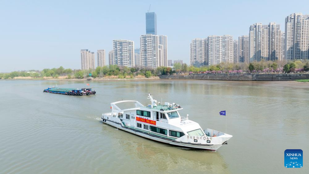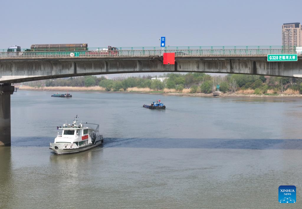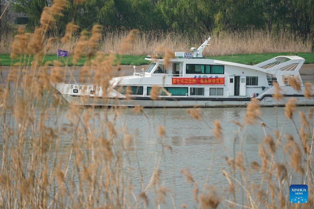 Jiangdu water administration law enforcement officers take a boat to patrol the water source of the eastern route of the South-to-North Water Diversion Project in Yangzhou, east China's Jiangsu Province, March 26, 2025. The Jiangdu water control project in Yangzhou of east China's Jiangsu Province is located at the source of the eastern route of China's gigantic South-to-North Water Diversion Project.