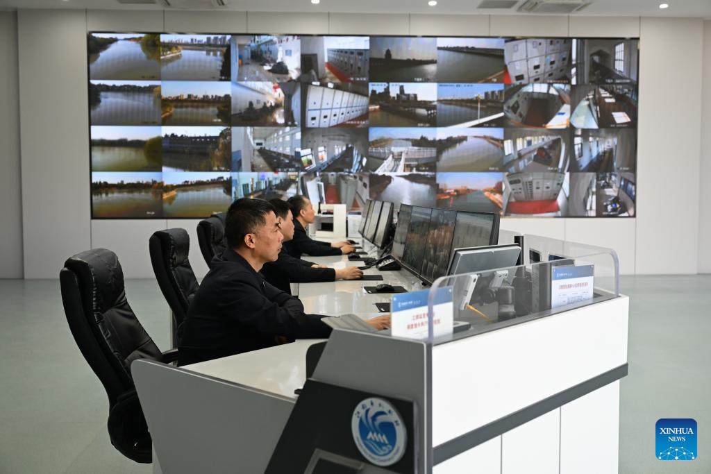 Staff members work at a control room of the Jiangdu water control project in Yangzhou, east China's Jiangsu Province, March 25, 2025. The Jiangdu water control project in Yangzhou of east China's Jiangsu Province is located at the source of the eastern route of China's gigantic South-to-North Water Diversion Project.