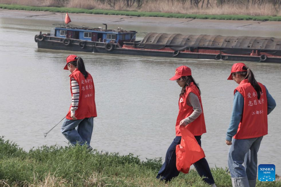 Volunteers collect rubbish along the water source of the eastern route of the South-to-North Water Diversion Project in Yangzhou, east China's Jiangsu Province, March 26, 2025. The Jiangdu water control project in Yangzhou of east China's Jiangsu Province is located at the source of the eastern route of China's gigantic South-to-North Water Diversion Project.
