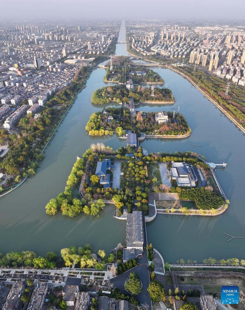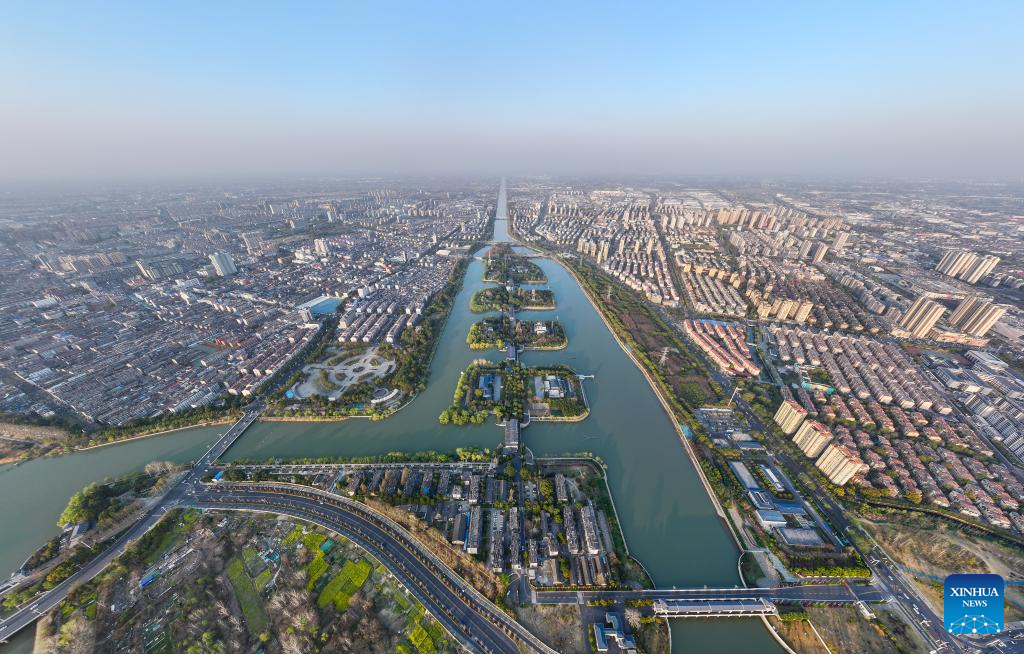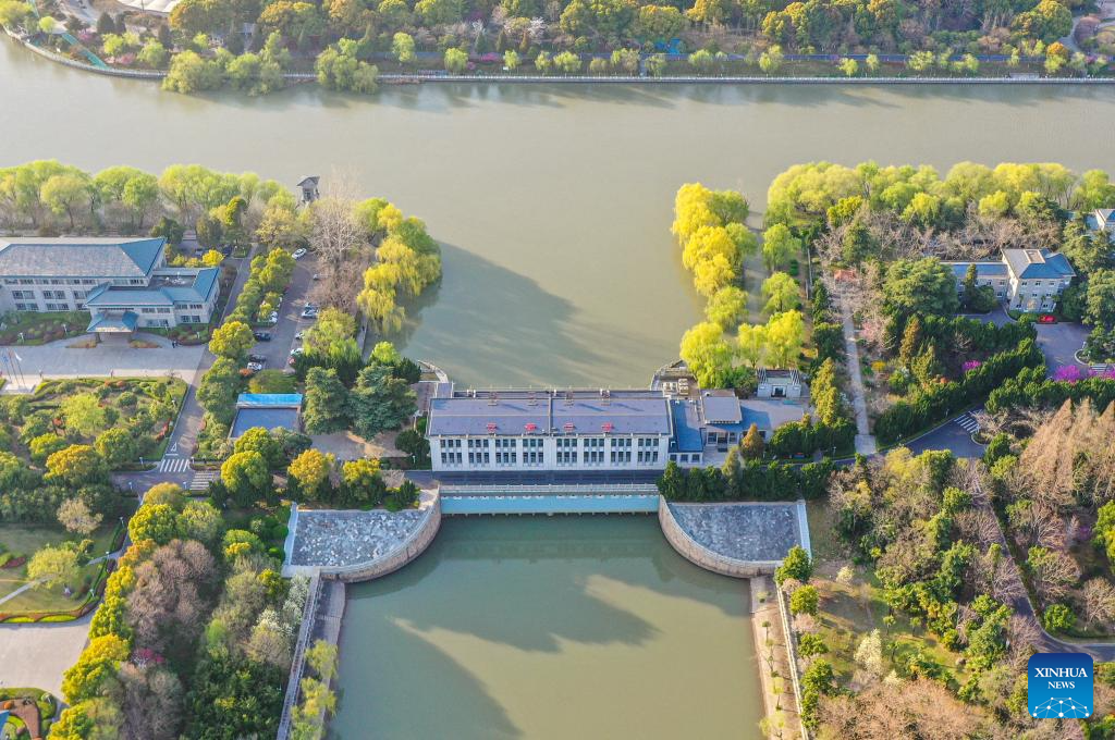 An aerial drone photo taken on March 25, 2025 shows the Jiangdu water control project in Yangzhou, east China's Jiangsu Province. The Jiangdu water control project in Yangzhou of east China's Jiangsu Province is located at the source of the eastern route of China's gigantic South-to-North Water Diversion Project.