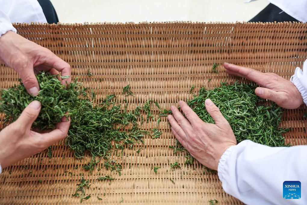 Workers process Juyan tea leaves at a tea company in Jinhua City of east China's Zhejiang Province, March 31, 2025. The Wuzhou (ancient name of Jinhua) Juyan tea has recently entered its harvest season. The making technique of the Juyan tea, together with that of Longjing tea (West Lake Dragon Well tea), Changxing Zisun tea (a tea variety originated from Changxing County) and some other reputed tea varieties in Zhejiang, was inscribed on the World Intangible Cultural Heritage List in 2022.