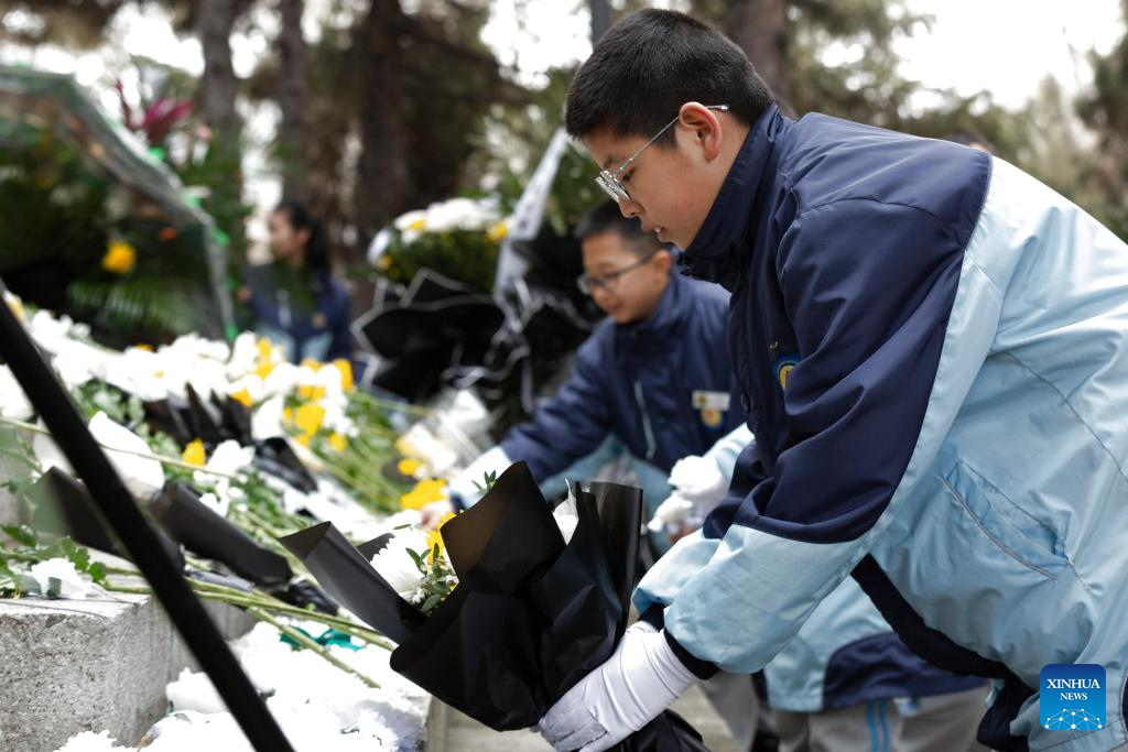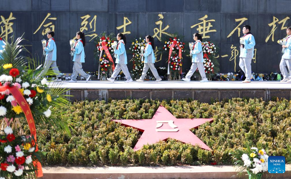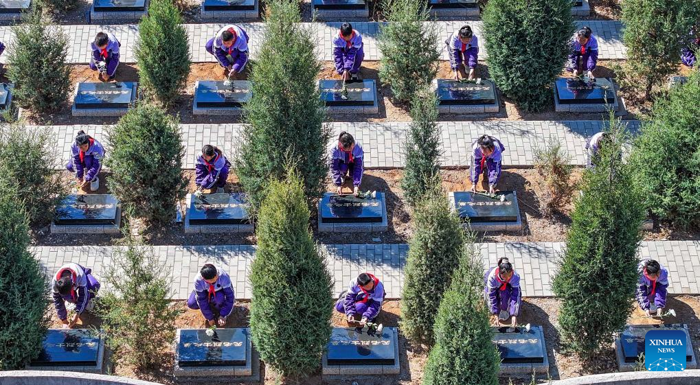 Students pay tribute to martyrs at a martyrs' cemetery in Jiyuan City of central China's Henan Province, April 2, 2025. People across the country attend tomb-sweeping activities to pay tribute to martyrs ahead of the Qingming Festival, which falls on April 4 this year. (Photo by Duan Erping/Xinhua)