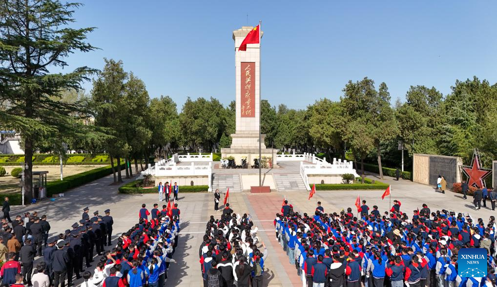 An aerial drone photo taken on April 2, 2025 shows students paying tribute to martyrs in front of a monument in Pingdingshan City, central China's Henan Province. People across the country attend tomb-sweeping activities to pay tribute to martyrs ahead of the Qingming Festival, which falls on April 4 this year. (Photo by He Wuchang/Xinhua)