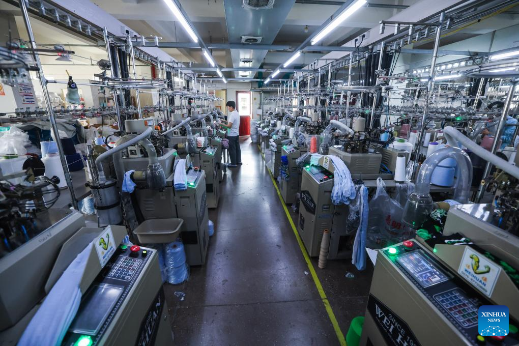 A worker is seen busy at the workshop of Baoge, a hosiery manufacturing enterprise, in Zhuji City, east China's Zhejiang Province on April 10, 2025. (Xinhua/Xu Yu)