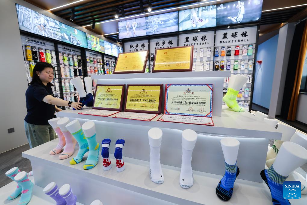 A staff member arranges sports socks at the exhibiting hall of Zhuji Yuanjin Textile Co., Ltd. in Zhuji City, east China's Zhejiang Province on April 10, 2025. (Xinhua/Xu Yu)