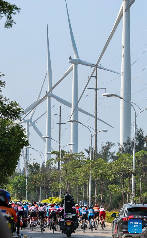 Cyclists compete during Stage 5 at the 16th Tour of Hainan cycling race from Dongfang to Sanya, south China's Hainan Province, April 11, 2025. (Xinhua/Yang Guanyu)