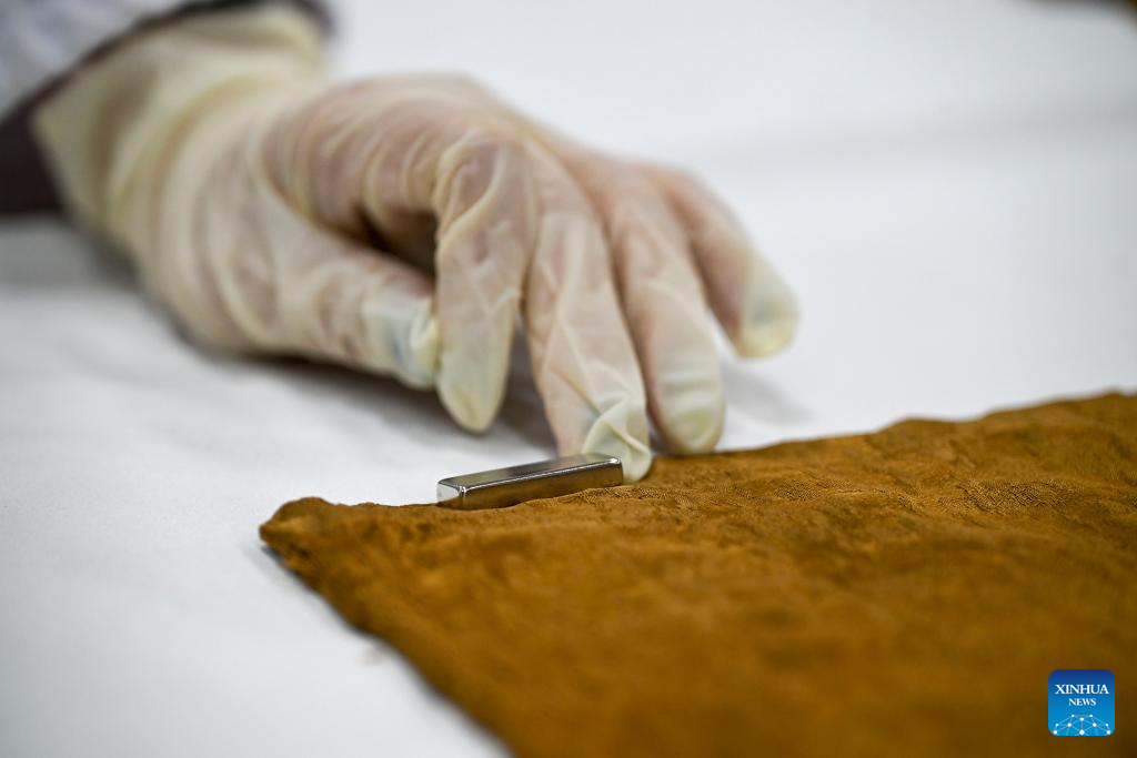 Suzhou Silk Museum staff member Chen Yanlu tests the color of a cultural relic in Suzhou, east China's Jiangsu Province, May 18, 2025. (Xinhua/Chen Shuo)