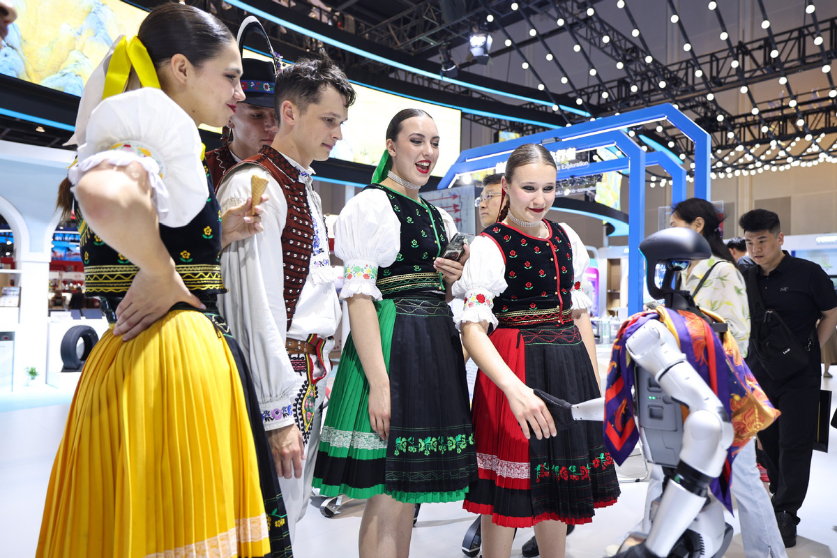 Foreign guests interact with a humanoid robot during the 4th China-CEEC Expo & International Consumer Goods Fair in Ningbo, East China's Zhejiang province, May 22, 2025. (Photo/Xinhua)