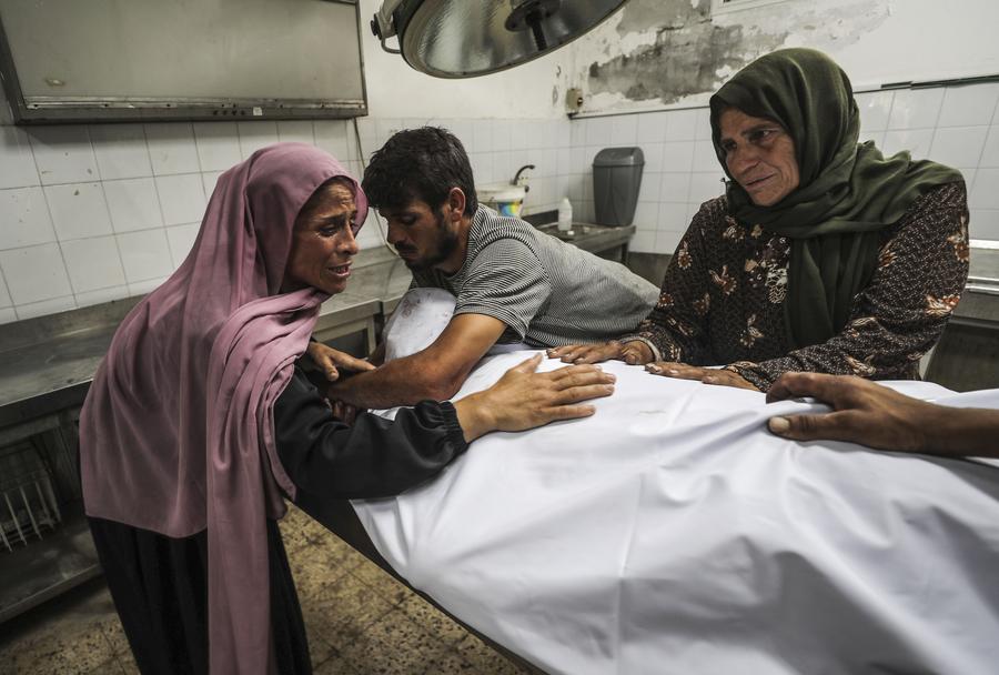 Palestinians mourn a victim killed by the Israeli army at Al-Shifa Hospital in Gaza City on June 15, 2025. (Photo by Mahmoud Zaki/Xinhua)