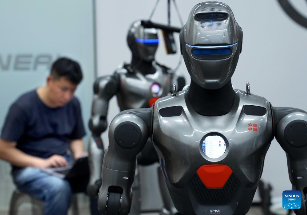 A staff member debugs a humanoid robot at a robot company in Shenzhen, south China's Guangdong Province, June 25, 2025. In recent years, Guangdong Province has taken various measures to develop the robot industry. The application and promotion of embodied artificial intelligence robots has been gaining speed in Guangzhou and Shenzhen, and a provincial embodied artificial intelligence robot innovation center was established in Shenzhen. In addition, cities like Foshan, Dongguan and Zhuhai are encouraged to give full play to their manufacturing advantages to build robot production bases.