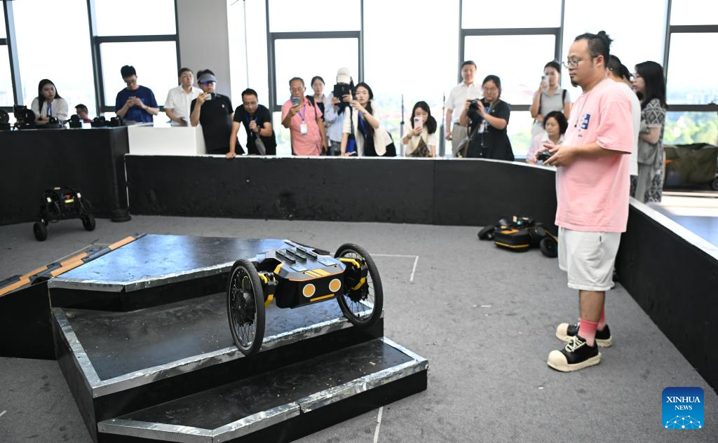 A pipeline inspection robot is pictured at a provincial embodied artificial intelligence robot innovation center in Shenzhen, south China's Guangdong Province, June 25, 2025. In recent years, Guangdong Province has taken various measures to develop the robot industry. The application and promotion of embodied artificial intelligence robots has been gaining speed in Guangzhou and Shenzhen, and a provincial embodied artificial intelligence robot innovation center was established in Shenzhen. In addition, cities like Foshan, Dongguan and Zhuhai are encouraged to give full play to their manufacturing advantages to build robot production bases.