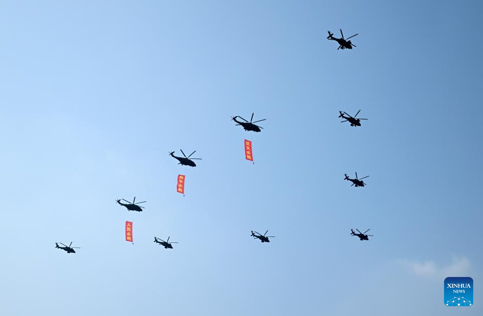 Helicopters form a huge numerical shape of 80 while flying over Tian'anmen Square during a grand gathering to commemorate the 80th anniversary of the victory in the Chinese People's War of Resistance against Japanese Aggression and the World Anti-Fascist War in Beijing, capital of China, Sept. 3, 2025. (Xinhua/Xiao Yijiu)